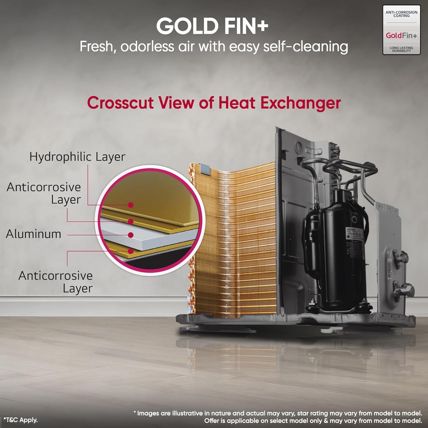 - Special Features: Gold Fin+ – Increase durability, Ocean black protection, Ez Clean Filter; Low Gas Detection; 100% Copper Condenser; Hi Grooved Copper; Split AC with Smart Diagnosis System; Comfort Air; Monsoon Comfort; Self Diagnosis; Auto Clean; On/Off Timer; Sleep Mode 12 Hr; Diet Mode Plus; Fan Speed Steps: 6; Auto Restart (Memory); On/Off Indicator; Dehumidifier; Frost Wash/HimClean; Child Lock Feature Remote